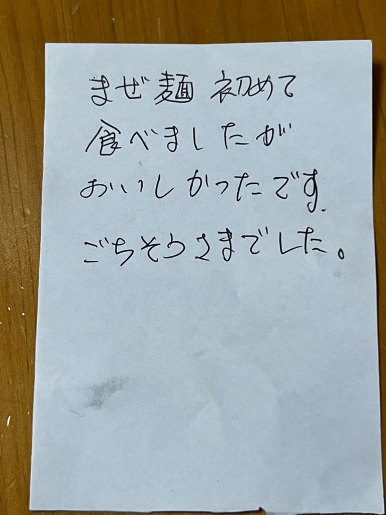 お言葉が少し不自由なご様子だった奥様が、一生懸命に綴ってくださった「美味しかった」の文字。
